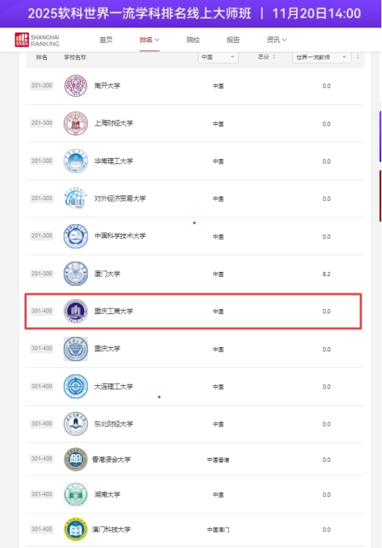 11月18日,中国软科正式发布2025“软科世界一流学科排名”,我院工商管理学科再度跻身全球前400强,在内地高校中位列33-43名,标志着我院在该学科领域的整体实力得到了权威认可和持续提升。