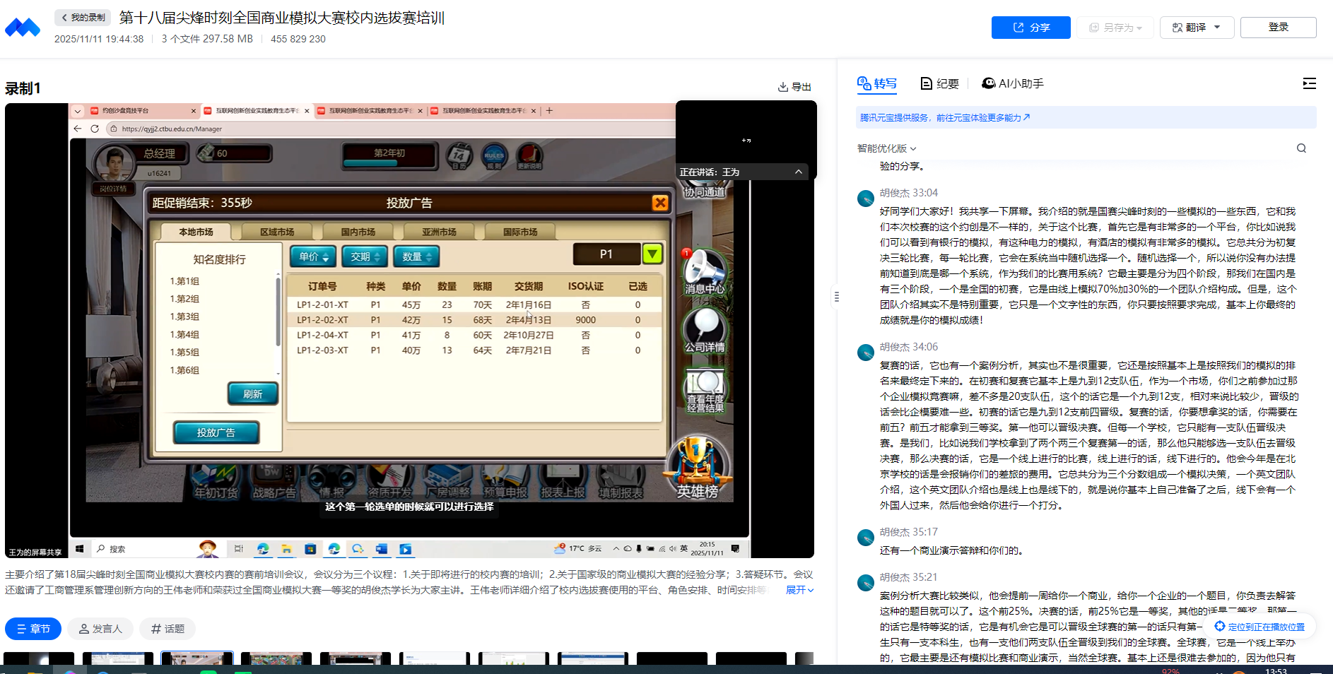 为保障赛事质量、助力选手高效备战,MBA联合会学科竞赛部于11月11日精心组织线上专题培训会,创新采用“校内赛与全国赛无缝衔接”的双轨培训模式:一方面,特邀经验丰富的王为老师“靶向授课”,围绕校内赛核心平台“约创”云沙盘模拟系统,从操作技巧拆解到决策逻辑分析,为选手搭建系统的理论框架与实战思路;另一方面,特别邀请往届全国赛优秀选手胡俊杰学长“传经送宝”,结合自身参赛经历,前瞻性解析全国赛竞赛系统、完整赛程流程及实战避坑要点。这场“理论+实战、当下+未来”的双轨培训,为选手提供了全维度备赛指导,收获了参赛学子的广泛好评。