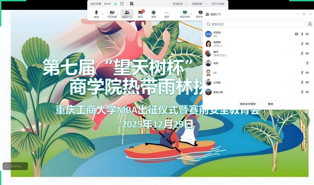 为鼓舞士气、凝聚力量,同时强化安全意识、保障顺利完赛,重庆工商大学MBA教育中心于12月29日线上开展第七届“亚林赛”出征仪式暨安全教育会。中心分管学生工作副书记程亚、中心副主任袁娅婷及全体参赛队员参加了会议。